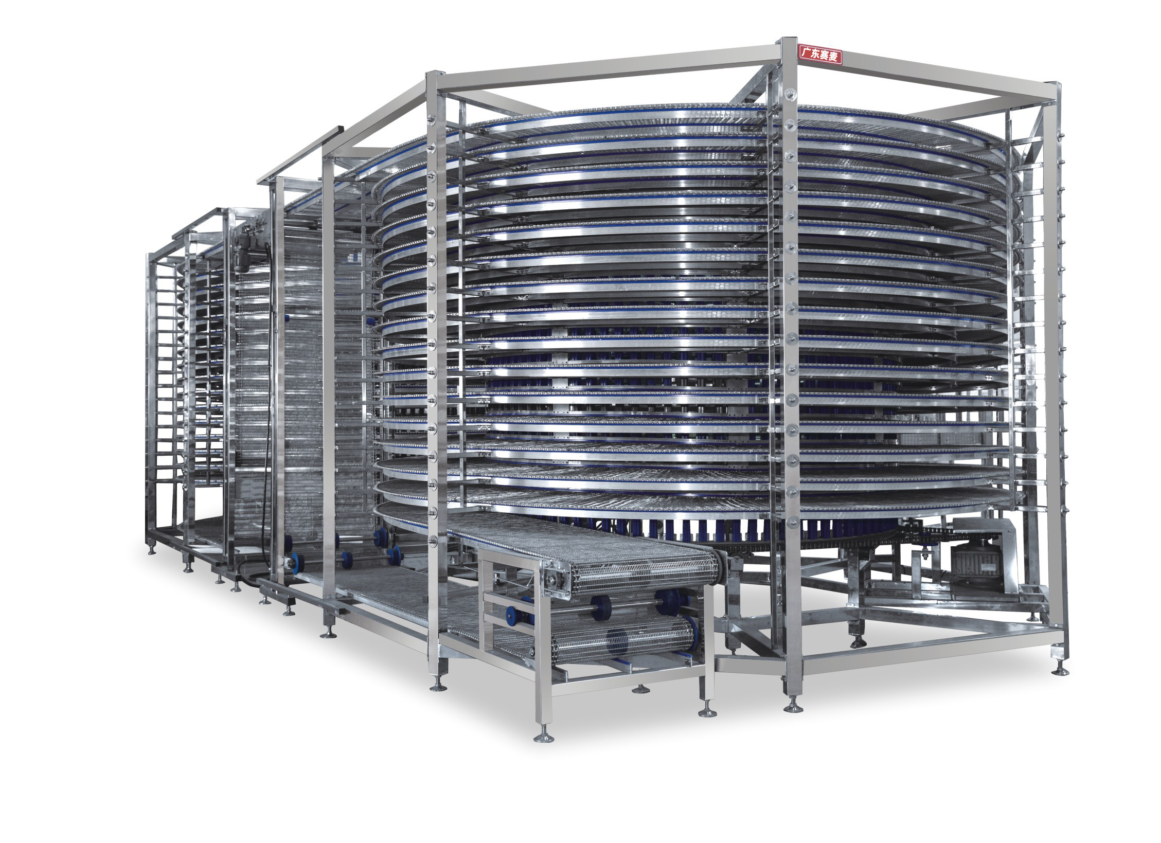 De spiraalvormige toren is geschikt voor de voedselindustrie, de lichte industrie, en automatische ononderbroken productie. Het beste materiaal voor vertragingsvervoer wordt gebruikt in vele processen zoals het materiële koelen, diepvriezen, het ondoordringbaar maken en vervoer.